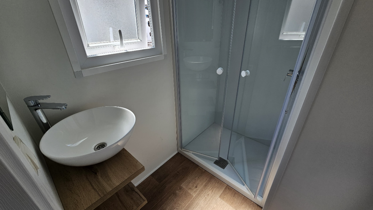 Houten bungalow compleet met Twee-pits inductiekookplaat, koelkast(1deur) met vrieskast, 2 tafels en 10 stoelen. Met warm water, douche, toilet en afwasbak.