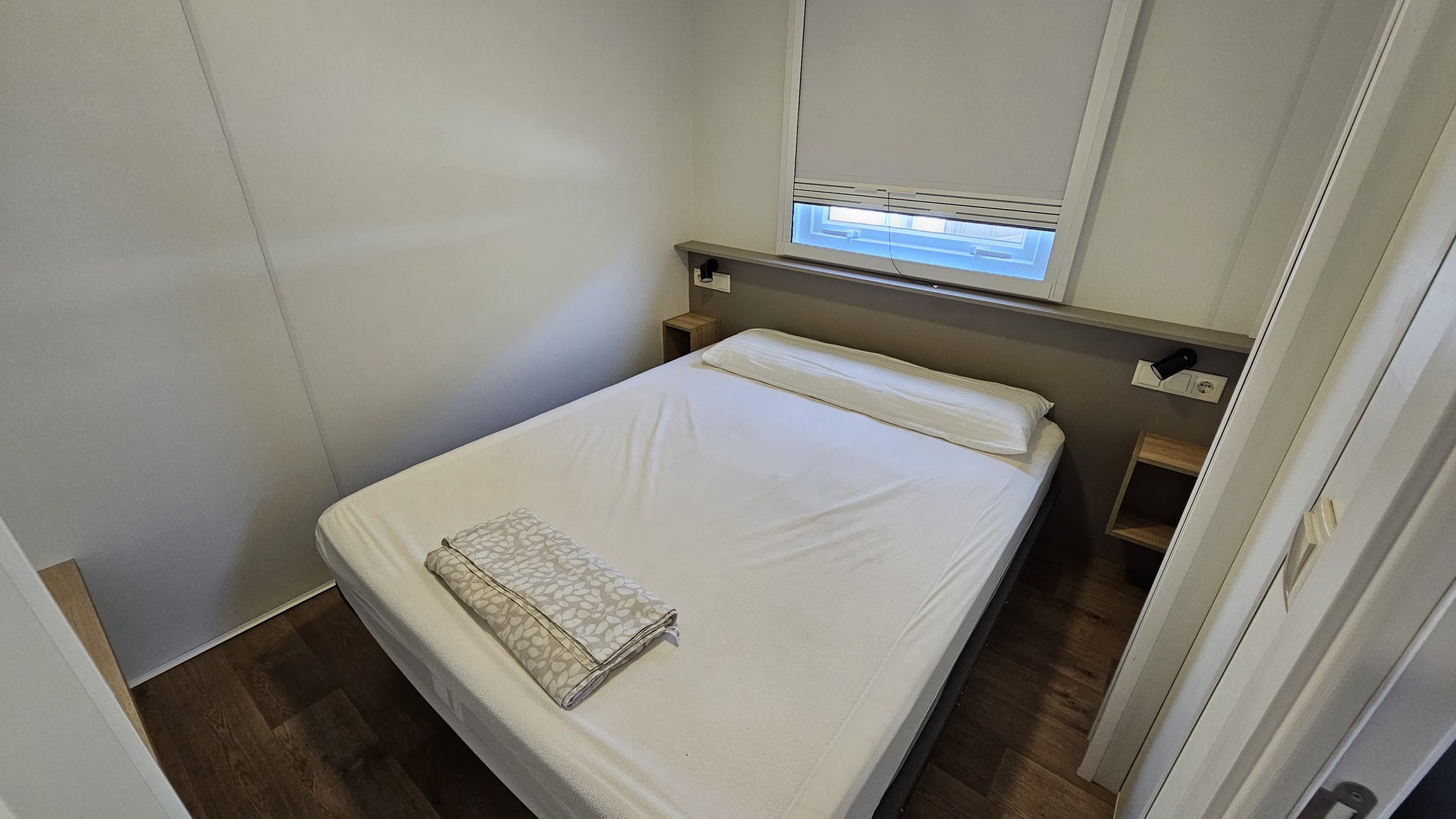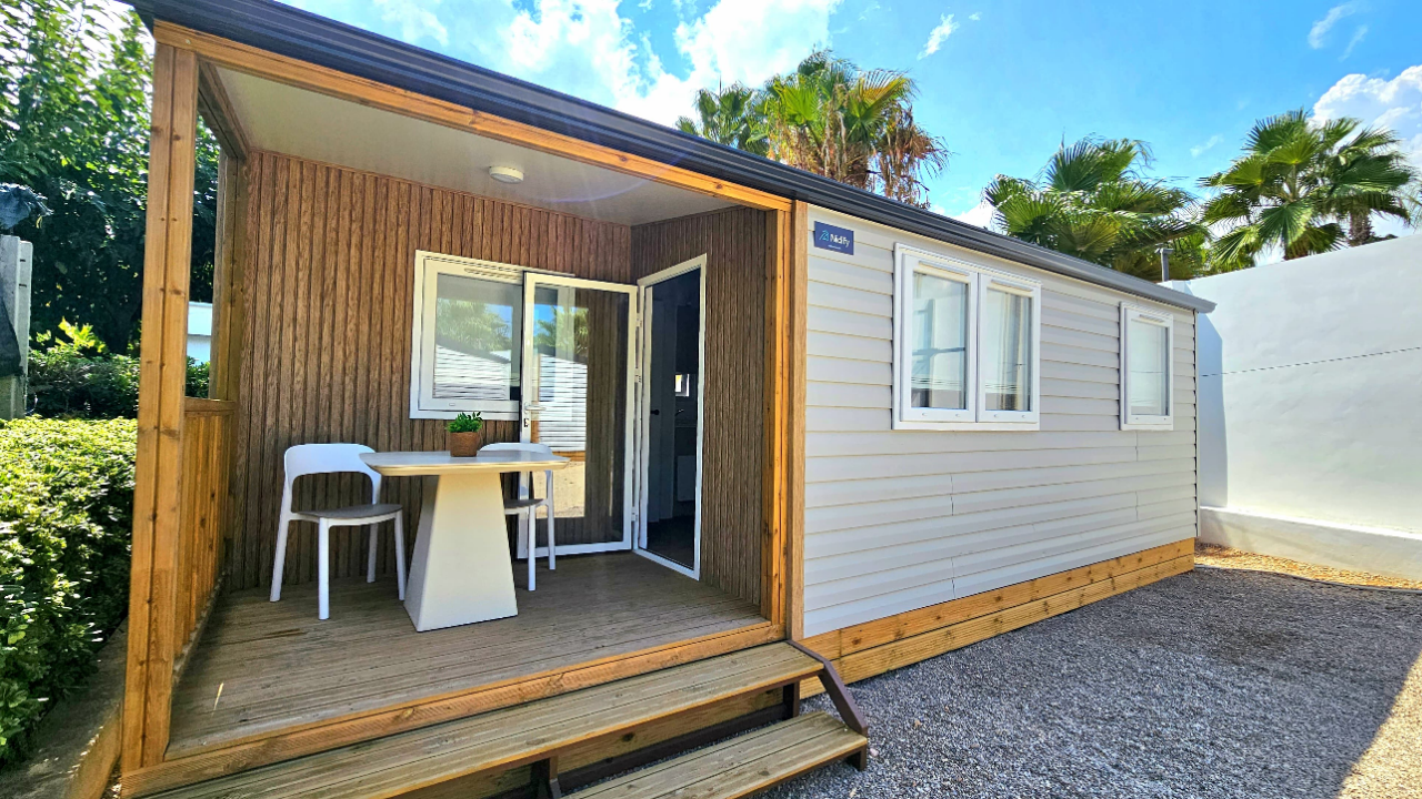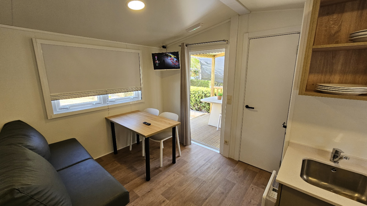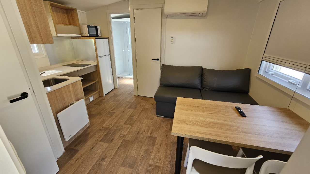 Houten bungalow met buitenterras soort veranda uitgerust met gootsteen, Inductie kookplaat, grote tweedeurs koelkast met vriezer. Een tweepersoonsbed 135 cm breedte en twee stapelbedden met twee bedden 80 cm breedte. Ingerichtet met tafel en 6 houten stoelen..